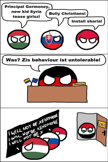 In 2017 memes were spearheading a line of parodic and sarcastic critique levelled at the reactions of European politicians to the Migrant crisis (see the Countryball satire above).