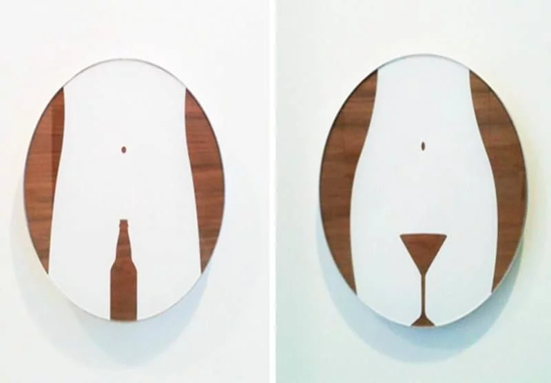 Next, we have the toilet signs in Figure 3. The location of these signs is unknown. Whereas our previous two figures played into either genitalia or gender norms, figure 3 manages to combine the two in a, it has to be said, clever visual manifestation. They make use of what is called a ‘Gestalt switch’. This is when one can see two different shapes in a picture, depending on what part they focus on. When focusing on the white, one can see a classic male shape on the left and a classic female shape on the right. The dark brown spaces in the place where normally the genitalia would be, consequently add to the distinction between the two toilets. The penis is replaced with a beer bottle, which both resembles the penis in shape and is seen as a masculine drink, therefore indicating that this is the men’s toilet. The same is done with the cocktail class mimicking the shape of the vagina, since cocktails are seen as a more feminine drink, marking it as the female bathroom. Thus, the signs play into both genitalia and gender norms, which, to top it all off, are both universal.