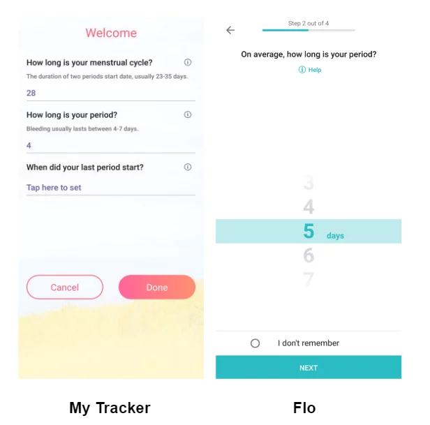 This construction of the intended user continues through the functionality of the app. Each app, upon starting the app for the first time, prompts the user through a set of “onboarding” questions before moving to the normal view of the app. Each of the apps surveyed includes a question on average length of both the period and cycle. However, in every single app this interface starts from a default and then allows you to select from a predetermined range, rather than prompting you to enter a number from your keyboard. This assumes several things about the user: one, that periods are regular (note that one of the examples below is from Flo, which claims to predict even irregular periods), and two that there is a range, however large (or small) that can be applied to all users. The fact that a default exists at all creates a notion of average or “normal.”