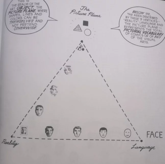 In 1993 Scott McCloud wrote a graphic novel about the art of comics and how to understand them ‘Understanding comics, the invisible art’. In this book he goes through the (rich) history of comics as well as the theories behind comics. He starts with his definition of a comic, which he takes different steps for to arrive at. Resulting on Page 9 in his definition of comics shown in the picture above. According to McCloud all comics can be placed on the ‘picture plane’, a triangular shape with the three dividing corners: reality, language and the picture plane. (McCloud, 1993)
