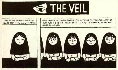 Secondly it is an instruction on how to read the novel. In the first panel we see Marjane, in the second picture is a drawing of a school picture showing her peers but only Marjane’s left edge of her body. The text reads: ‘And this is a class photo. I’m sitting on the far left so you don’t see me. From left to right..’ However, we see Marjane very well to the far left, in the other frame. All the girls look almost all exactly the same, but we should look at Marjane differently. She is not part of a group. We should already understand: ‘Individuality despite seriality’ (Chaney, 2011)