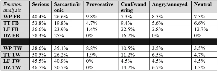 When the figures of the emotion analysis are put side by side, it is seen that there are no extreme outliers in the expression of emotions in the comments on either Facebook or Twitter (figure 2). On all four platforms on both Facebook and Twitter, the percentage of users who seriously raised the issue is the highest. It does become clear, however, that people on Twitter are more inclined to adopt a sarcastic/ironic or otherwise 'funny' tone in their reporting. This may be explained by the high-level affordances that define Twitter as a microblogging platform where throwing out a short 'Tweet' is the norm. Users may be more inclined to blurt something out and thus make fun of serious subjects.