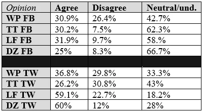 When delving into how the discourse varied between Facebook and Twitter, it stood out that users on Twitter were more likely to post a comment expressing an opinion, while users on Facebook more often remained neutral in expressing an opinion. This confirms the anonymous character of Twitter where communication is not about mutual one-to-one communication, but about one-to-all communication where shared interests are central instead of mutual friendships.