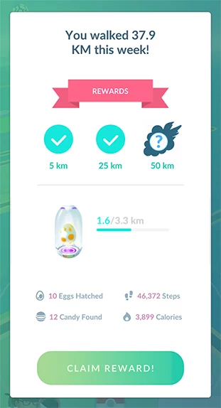 Further, Pokémon eggs can only be hatched by reaching certain walking milestones. A designated pool of Pokémon hatch when 2, 5, 7, or 10 kilometers of walking distance have been accomplished. Users are motivated to perform various outdoor activities knowing that these virtual prizes are ahead of them.