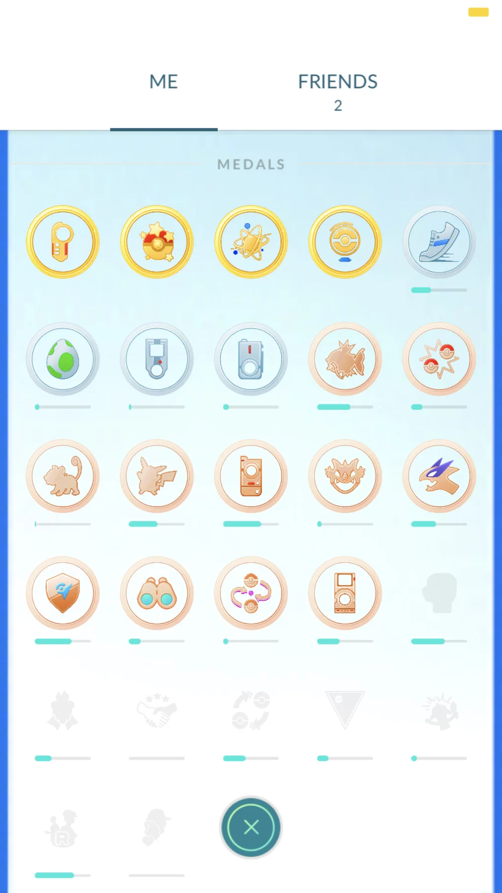 Consistent with other gamified self-tracking applications, Pokémon Go enables the conceptualization of users’ progression through an achievement system. Essentially, medals are related to different accomplishments within the application; for each of these, users complete an initial objective to receive the bronze medal, then must complete three additional tiers of objectives to progress to silver and gold medals.