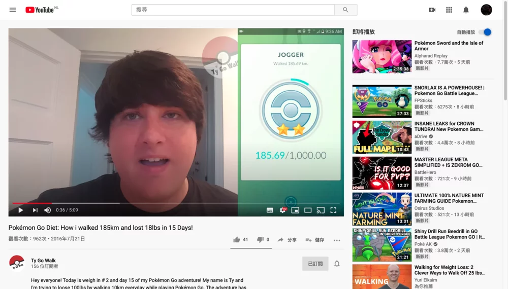For example, in a video titled “Pokémon Go Diet: How i walked 185km and lost 18lbs in 15 Days!”, YouTuber Ty Go Walk’s records his weight loss plan. According to the vlogger, his idea was to walk a minimum of 10 kilometers every day while using Pokémon Go. To briefly summarize the video, Ty Go Walk reports that he had walked 100 kilometers during the first week and 85 kilometers during the second week, adding up to a total mileage of 185 kilometers since the vlogger initiated his workout plan. Additionally, to illustrate his efforts, Ty Go Walk edits in a screenshot of his progress for the Jogger medal, which indicates the total amount of walking distance since he began using the application.