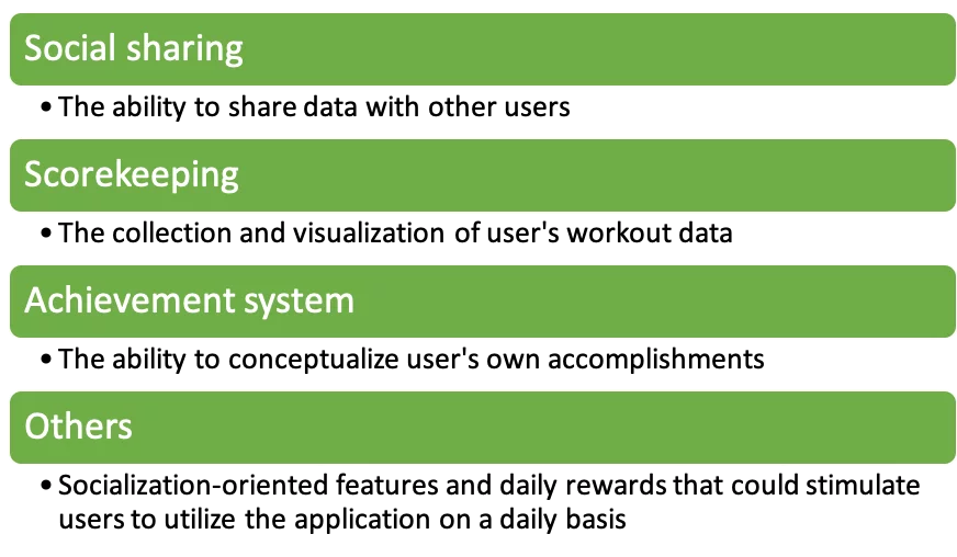 The idea of utilizing video games for fitness purposes is not a recent development, as games like Nintendo’s Wii Sports have already demonstrated their potential. However, concept of fitness gamification, defined by Wylie (2010) as “employing game components to motivate individuals to reach their personal health goals” (p.1) has only recently emerged alongside smartphones and mobile applications. Wylie has identified four elements of gamification that are commonly found in successful self-tracking applications: