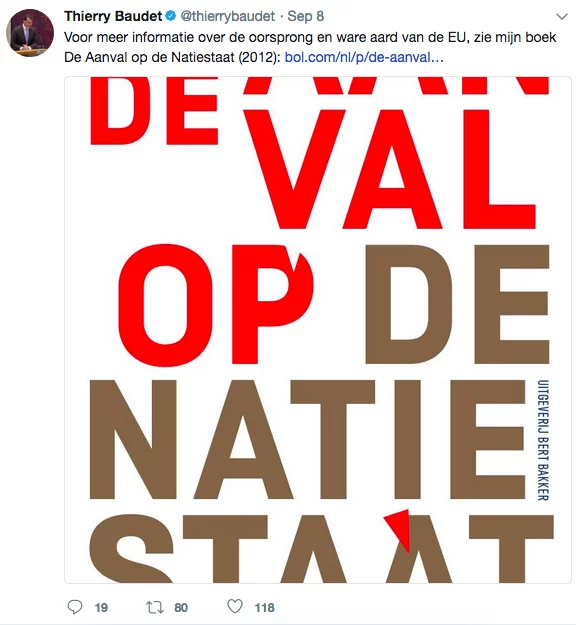 He expresses disgust as he includes the fact that population numbers have nearly tripled since the influx of refugees, which started in 2015. Baudet often also promotes his book, De Aanval op de Natiestaat, on his Twitter as can be seen in Figure 5. This sign of nationalism showcases that he feels threatened by the increasing foreigners and is determined to keep the Dutch identity 'pure'.