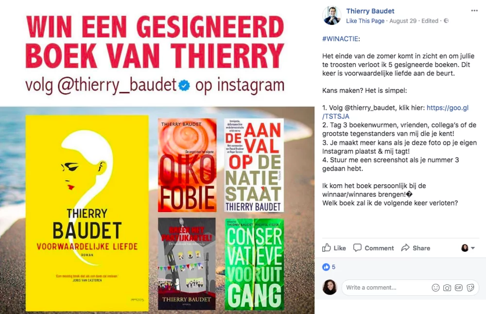 Baudet is also active on Facebook, where his personal Facebook account is ‘exclusive’ as one has to send a friend request and cannot simply follow his page in order to stay updated with his posts. In the first public post below, he is organizing a giveaway of his own book as a way of promoting his Instagram account. Those who follow his Instagram stand a chance to win his book and feed into his ideas of anti-islam, anti-immigration and pro-purism. The title of the book is noteworthy as ‘De Aanval op de Natiestaat’ translates to ‘Attack on the nation’, stipulating that Baudet, as aforementioned, sees the influx of migrants as a threat on not only the country but also Dutch culture. The post about the book reinforces his beliefs about migration and that he is proud of what he has to say about it. What is interesting to note is that the post only received 5 ‘likes’ while his page has 2.2k followers. This could be due to the algorithm of Facebook's as more popular figures and sponsored posts are usually shown first.
