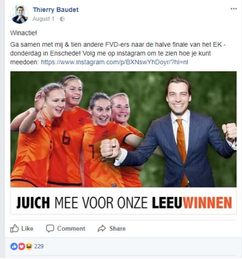 Baudet’s nationalistic attitude makes another reappearance in Figure 11 below, a post aiming for virality and a commercial communication as he is promoting not only his instagram account but also supporters of the FVD in a giveaway where he allows for his audience to attend the semi-final of the Europees Kampioenschap (EK) in Enschede.