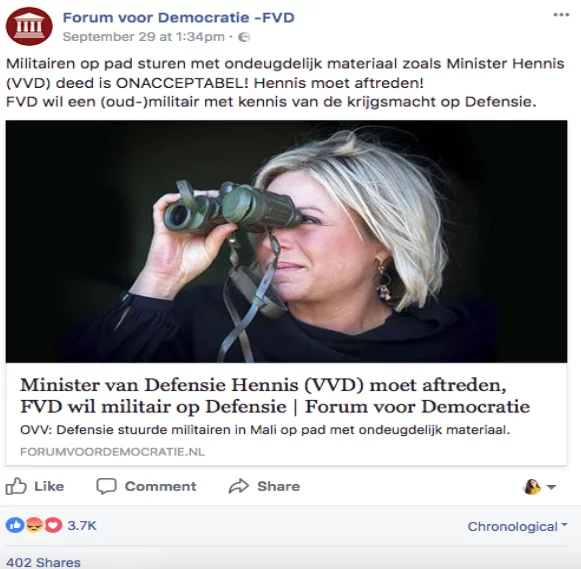 The post addresses an opposing party, Volkspartij voor Vrijheid en Democratie, a conservative and liberal political party, by stating that the minister of defense, Jeanine Hennis-Plasschaert, should step down from her position. The post received online attention, with 3.7k reactions, 923 comments and 402 shares. The types of reactions showed that not all of the users are in favour of this opinion, as can be seen by the angry reaction button in the middle. This shows that although FVD is supported by many, not all of the ideas are supported and although the party is active, the ratio of followers to public interaction isn’t as engaging as one would expect. One reason for this is algorithmic populism (Maly, 2018) as social media relies on engagement, with the voice of the audience in relation to the algorithms.