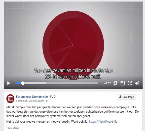 The algorithms of Facebook and other social media platforms such as Twitter, Instagram and Snapchat all promote the use of videos as a medium to attract attention and convey information. By packaging the voice of Baudet and his Forum voor Democratie in video they use the algorithms to spread their voice. The party also recently shared a celebratory video about their one year anniversary, pictured in Figure 2, as FVD has officially been active for a whole year. The video addresses the audience personally and thanks them, informing them about politics in the Netherlands by stating facts such as “There are 17 million people in the Netherlands, but only 2% of the population is involved in politics.” This is a subtle promotion, as a link to become a member of FVD is attached in the caption underneath the video.