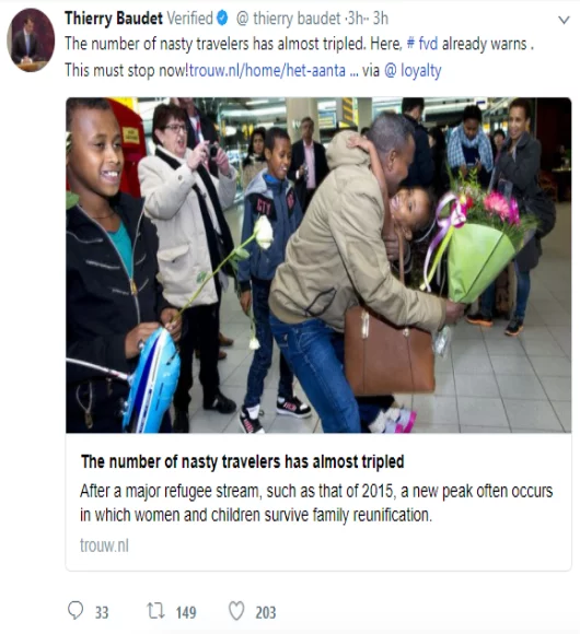 His Instagram shows a very different side to him and he appears more likeable as this account shifts dynamics from public to private, allowing us, as the outsiders, a closer look into his life. Baudet becomes relatable, posting memes - often ones of himself - that a large majority of online users enjoy, shown by the number of ‘likes’ and comments beneath each update he posts. His interests are expressed through pictures and videos of him paintballing and fishing with friends, playing music with his family and having fun with his dog, all of which assists in the creation of his ‘family man’ identity. There are also a few selfies added to his Instagram feed. By including these photos, he appears to not take himself too seriously which is important to note as people have a set mindset about what politicians are supposed to be like, ie, serious and formal, not only in way of speech but also clothing choice, usually by wearing a suit and barely smiling. In Baudet’s pictures, he is laughing, joking around and wearing everyday clothes such as jeans and a t-shirt, showing that he is “normal” too. In addition to him as a person, the type of content Baudet posts reveals a lot about his political views and the aims of Forum Voor Democratie and he clearly asserts his position on certain topics. Something he is very vocal about is his goal to reduce the number of migrants. As can be seen in the screenshots attached, all of which are from his Twitter account, Baudet regards them [the migrants] as ‘nasty travelers’.