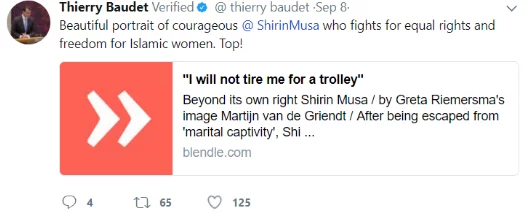 In the book, it is stated that ‘European unification and multiculturalism has weakened the nation state’, a clear indication about his beliefs regarding not only the refugee crisis and the impact it has had not only on the EU but also supranational institutions as one of the key features of supranational institutions include nominating various individuals to assist and embody the cumulative 'European' interest (Krase,2017). In Figure 6 below, a niche audience is addressed where Baudet indirectly states that he supports Muslim activist Shirin Musa who is fighting for equal rights amongst Muslim women. Through this, a message is given to the audience as it is in favour of Islam by targeting the Muslim community in the sense that it creates the image that Baudet is inclusive and accepting of minorities. In other words, Baudet is positioning himself as someone who is pro-freedom and equality.