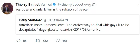 In Figure 7 above, Baudet is taking a nationalistic stand against the EU, where it looks like he is reinforcing his main idea of NEXIT, a situation where the Dutch would hypothetically withdraw from the EU. It is common for right wing populists to oppose the 2015 migrant crisis that brought thousands citizens from mainly Muslim countries to European countries; a controversial time and a reason why many right-wing populists are against migrants and in favour of NEXIT. A sarcastic comment is made in Figure 8 below and used to draw attention to the negative side of migration. Baudet attempting to advance his argument through his comment which has been retweeted 382 times, favourited 451 times and received 65 comments. It’s clear to see his use of sarcasm has made an incredible impact. Not only is he sharing a retweeted post, where he is against Islam’s views of peace in relation to homosexual individuals, but he is positioning himself once more and aiming right for his target audience; those who are against Islam, foreigners and pro-homosexuality.