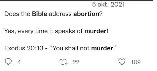 For example, pro-life believes abortion deliberately kills and takes the innocent life inside a womb. The bible states that 'you shall not murder'. As demonstrated in this tweet (Figure 1), Christian pro-lifers interpret it literally as: ‘then, abortion is also murder' (Gant, 2022).