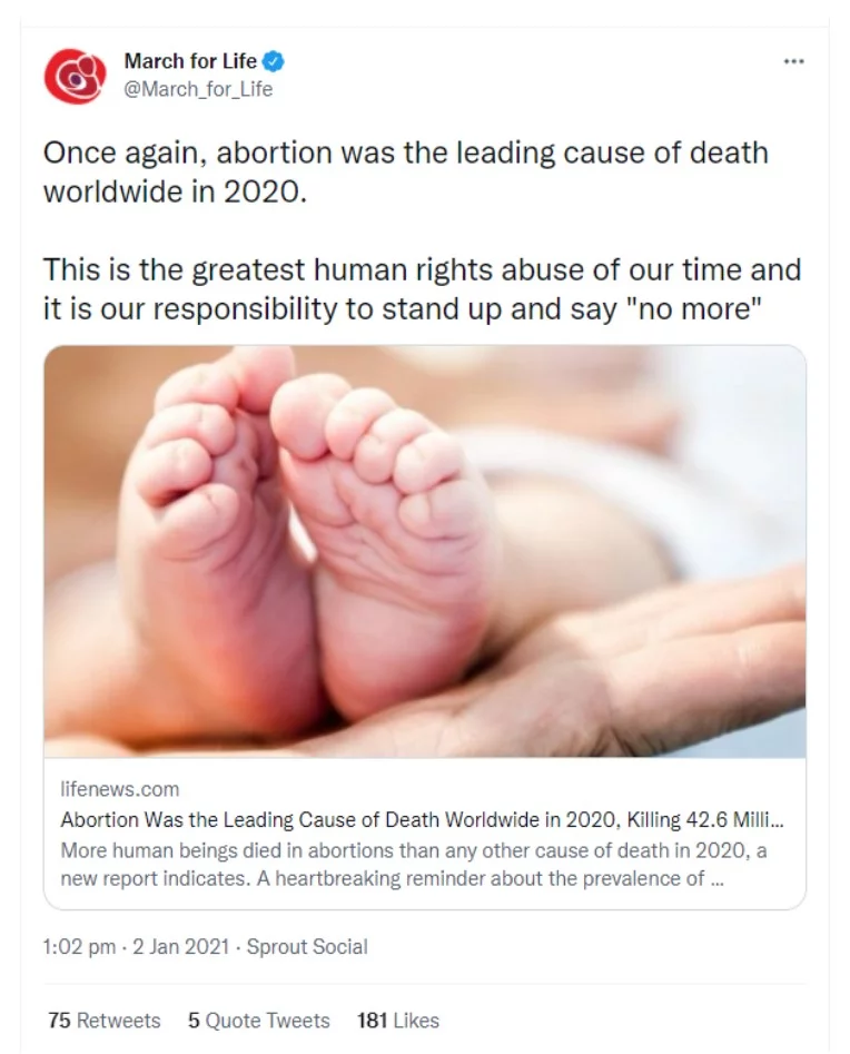 The biggest anti-abortion transnational organisation, Live Action, was founded by anti-abortion activist Lila Rose and claims to have more than 5 million supporters globally. The organisation has educational purposes but was founded for pro-lifers to take action and make a difference. They do undercover operations at Planned Parenthood and abortion clinics trying to expose abortion procedures and their ‘wrongdoings’. They also report pro-life news like Marches For Life not only in the US but also report on March for Life protests in other countries. Their Twitter account has more than 140k followers.