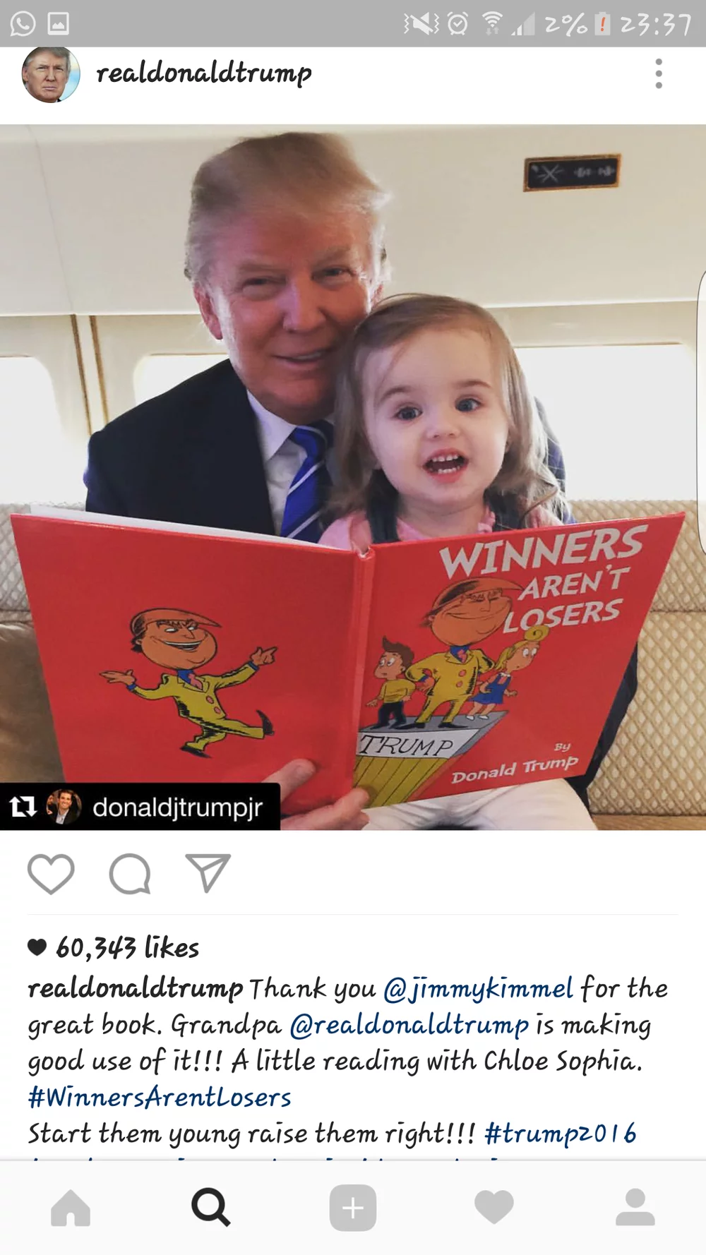 The above post from February 17, 2016, shows how Trump talks about his standpoint on abortion in quite some length. He begins by very shortly stating his opinion on abortion, and then continues by focusing on family life, which strengthens his image as a family man. He personalizes his message by saying that he has had "a significant experience which brought the precious gift of life into perspective for me’".