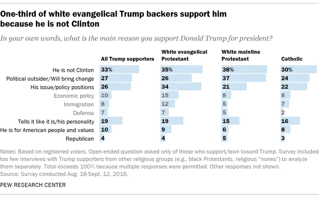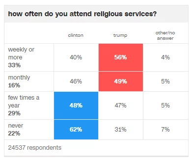 When one looks at Donald Trump’s Instagram account, it is clear that he portrays himself as a proud grandfather. From time to time, he posts a picture of himself and his children or grandchildren to show the world that he cares a lot about his family. As he makes his statement that he is pro-life, Trump sends out his messages through these posts about his family. None of his posts about his family are explicitly religion-bound. This does not mean that Trump is not appealing to Christians with this type of communication. Even though his social media posts are not about religion, part of his message is still religious and appeals to values Christians find important e.g., being a family man. Next to such implicit communication, Trump also explicitly identifies himself as a Presbyterian, part of a Christian protestant movement, and has said that he attends church, which seems to also be an important factor for Christian voters, as shown in the figure below.