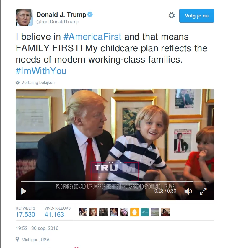 The screenshot below is a tweet from Donald Trump from September 2016, which includes a video about family values and what his plans are to take care of the families in America. Ivanka Trump, his daughter, is the narrator in the video. As a mother, wife and entrepreneur, she explains that Donald Trump understands the needs of a modern workforce and how important family care is. Trump uses his daughter to present the family values that he stands for. Through this video message, Trump creates an image of himself that is interesting for Christians, because of beliefs and values about family which are also deeply rooted in the Christian religion.