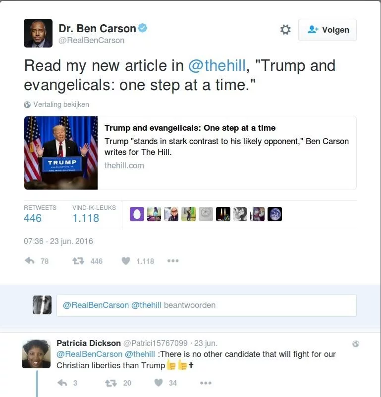 A key figure is Ben Carson, who was also a republican candidate and who is consistent in his Christian and republican identity and message through his social media platforms (Gommers, 2016). Carson dropped out of the campaign and planned to use his power to mobilize the Christians to vote for Trump.