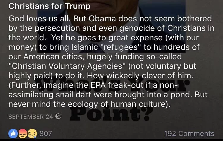 A similar post can be found on the page of 'Christians for Trump', who used the same technique. It starts with one of the most common Christian phrases: 'God loves us all'. However, after this statement, a contrast quickly emerges in which phrases such as 'genocide of the Christians' and 'with our money' almost immediately catch attention. Future genocide and the idea that American citizens would help this with their money, gives rise to anger within a common situation. What Christians might expect as a safe option is to find a father, Trump, who would fit their patriarchal views, who would fight for future generations of the USA and the sanctity of human life.