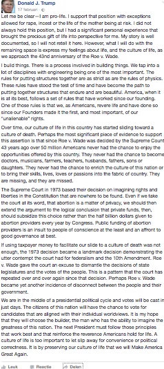 During his campaign, Trump took standpoint against abortion, which he talked about on both online and offline platforms. In this section, Trump's discourse on abortion on Facebook, and in several speeches and interviews, will be analyzed.