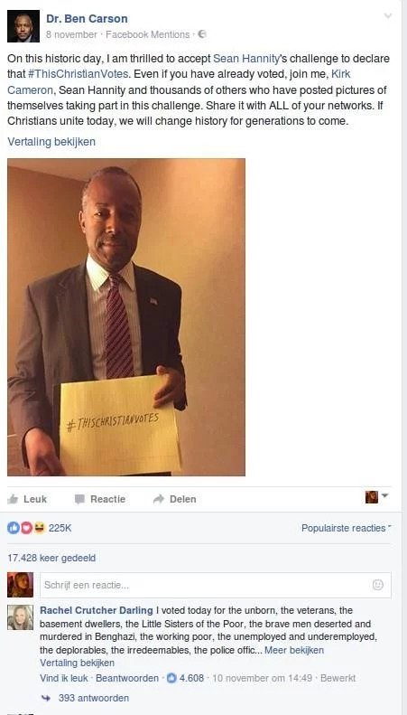 On election day, Carson posted a Facebook post with the hashtag #Thischristianvotes. With the use of the hashtag, he is aimed to go viral, which is also what he did before with his #IamChristian hash tag (Gommers, 2016). He is not explicitly stating to vote for Trump, but as a republican and posting this on election day, he implicitly calls the Christians to mobilize and go vote for Trump. Carson has reached quite a lot of people; for example his Facebook post with 225 thousand likes, 17,428 shared and 5,2 thousand reactions.