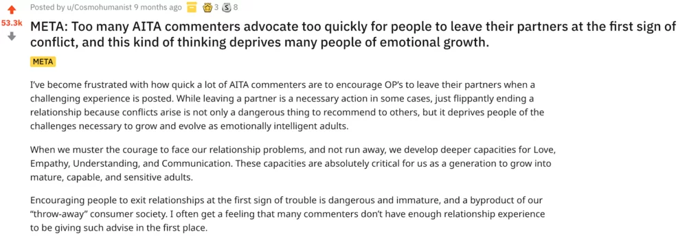 Giving the first judgment that comes to mind is often not sufficient. As many META posts suggest, the group discusses severe cases which require to be well-reflected and thoughtfully considered. The user u/Cosmohumanist, for instance, argued that many members provide short-sighted and immature relationship advice. Therefore, while members are asked to provide their authentic view on a case, certain judgments in specific situations are still considered inappropriate, even if they reflect a user's real opinion. These aspects of identity discourse and authenticity can be commonly found in 21st-century social groups (Blommaert, 2011).