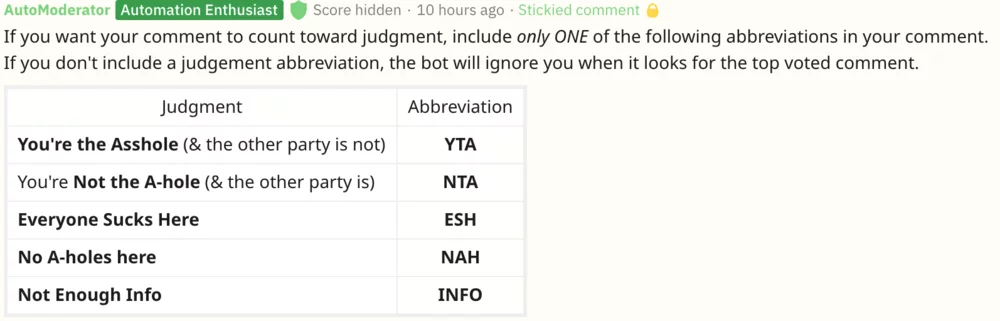 Apart from knowing the distinct rules of r/AmItheAsshole, new members need to master several other indexes to become truly respected authorities in the group. Basic understanding of internet and Reddit language is generally helpful in participating in group discussions. This, in particular, concerns commonly popular acronyms and references to Reddit culture.
