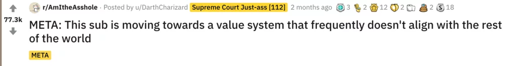 The subreddit's currently most upvoted thread is a META post created by the highly decorated member u/DarthCharizard. This post shows all the indexes of a veteran being in charge, as it received some of the most valuable rewards on Reddit alongside all four community-specific awards. Moreover, u/DarthCharizard, who maintains a prestigious position in the group's hierarchy as "Supreme Court Just-ass", is marking a climax in the debate of the preceding months. As stated in his or her post, the group's members seem to have contrasting beliefs or values to most people in society. While u/DarthCharizard does not provide an explanation for his/her observation, many users seem to agree. Some suspect that peer pressure has a significant influence on voting decisions, while others assume that younger audiences with questionable beliefs are behind the supposed shift in values.