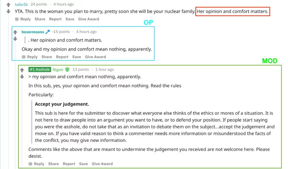 The titles of judgment-seeking threads are always formed as questions. They start with either AITA (short for "Am I The Asshole") or WIBTA ("Would I Be The Asshole"). Each post is accompanied by a brief description of the situation that should provide both sides of the story. Once a thread is published, other members of the subreddit can give their opinion on the actions and thoughts of the original poster (often referred to as "OP"). Moreover, users can participate in a unique voting system, which consists of five different judgments: YTA ("You are The Asshole"), NTA ("you are Not The Asshole" (but the other party is)), ESH ("Everyone Sucks Here," i.e., everyone is an asshole), NAH ("No Assholes Here"), and INFO (meaning there is not enough information). After 18 hours, a bot crawls through all comments on an individual thread and eventually calculates the most popular judgment. The thread is then labeled with the final verdict.