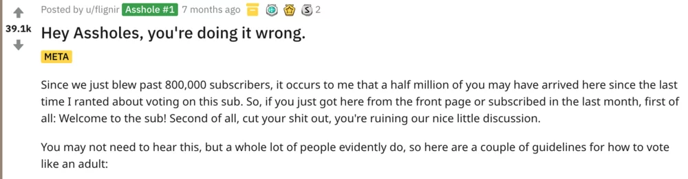In just under two and a half years, from January 2018 to June 2020, r/AmItheAsshole has grown from merely 35,000 members to an astonishing number 2.1 million subscribers. This immense growth was fueled by Reddit's front-page algorithm, which continually promotes the "hottest" posts platform-wide. As time passed, this increased visibility has led to a large identity discourse arising, spearheaded by the group's veterans. This debate is ostensibly ignited by META posts that blame inexperienced members for questionable judgments.
