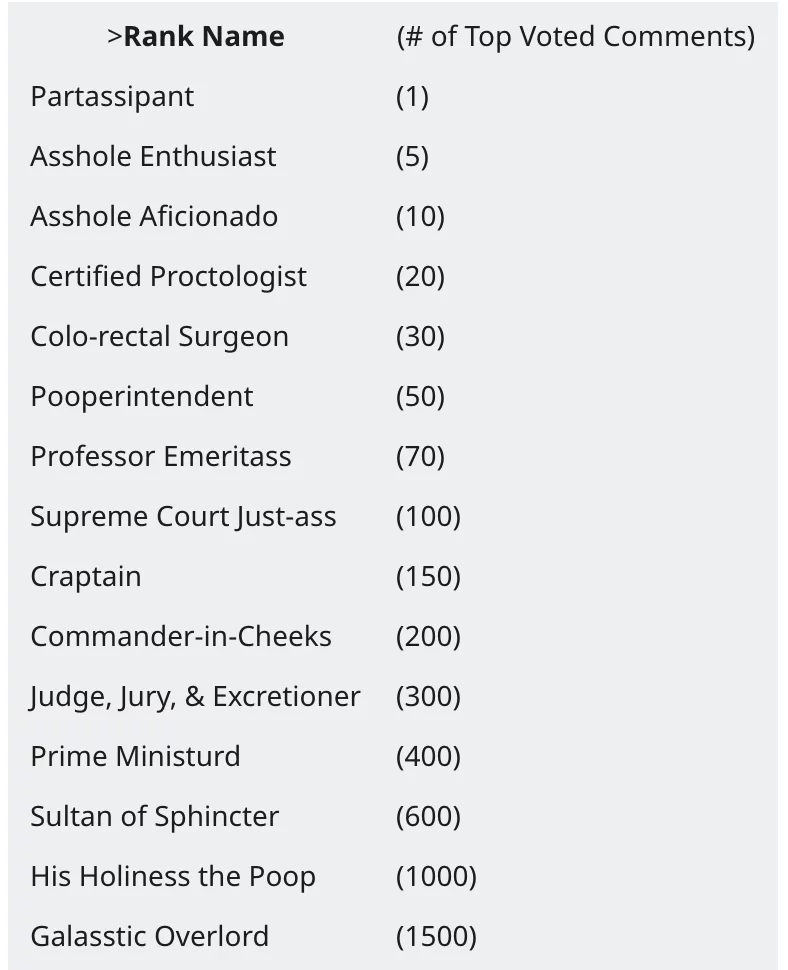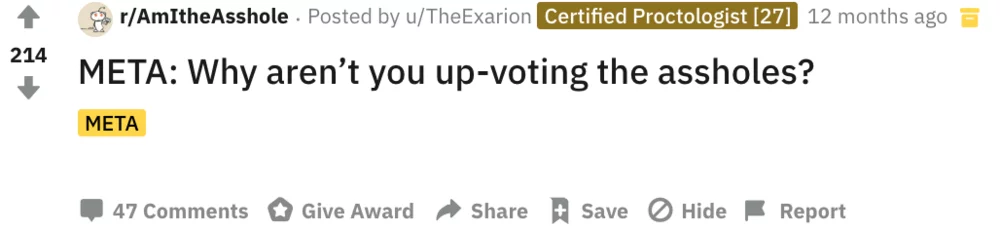 Last but not least, there is no better indicator of the authority of a member than his or her rank. This career system, which is present in many social groups, rewards frequently-engaging members with specific ranks, giving them more authority in turn (Becker, 1997, pp. 24-25). In the case of r/AmItheAsshole, members level up by posting "top-rated comments" on any threads within the group. In theory, the most valuable content receives the best rating. Consequently, being familiar with the rules, language, and especially META posts is often crucial to becoming a respected individual in the group.