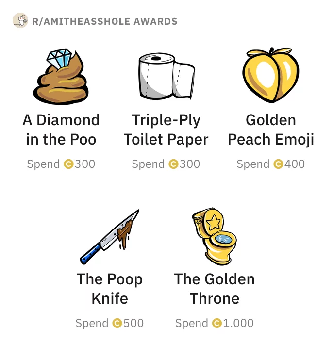 Reddit as a platform also features awards that users can acquire by using the platform's virtual currency, Reddit Coins. Owners of Reddit Coins can choose to reward specific posts or comments and their authors. Some rewards even come with a free subscription to Reddit Premium or free Reddit Coins for the recipient. Each reward is then shown on the contribution. According to Reddit, it "is a way to show appreciation for an exceptional contribution to Reddit." Additional awards are also available on a subreddit-level as r/AmItheAsshole features unique awards such as "The Golden Throne". This feature is also a light form of niche-commodification that is omnipresent in this day and age (Maly & Varis, 2015).