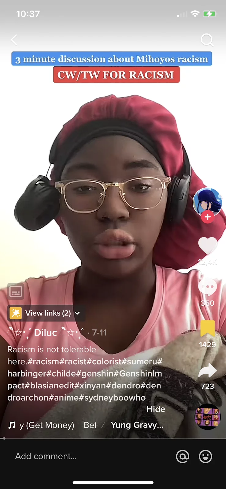 In this example, the user connects the racist implications of the non-playable dark skin characters Sumeru all being antagonists - enemies who the main character has to fight - to how a previously released playable dark skin character in the game is described as scary and annoying to the public around her. The user also brings up the issues in other projects of the company behind Genshin - specifically the black character being colorist against herself or the perpetuation of the stereotype of black women being ‘man-like brutes’. These types of videos bring the game in as an example of the wider social issues of harmful stereotypes towards POC within media and ingrained racism within the variety of systems, which is indicated by user’s use of hashtags beyond the game’s community - #racism, #racist, #colourism.