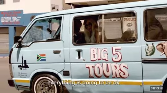 The video of ‘Fatty Boom Boom’ has a length of 5:42 and has a spoken introduction. It is divided into four parts. In the introduction, Lady Gaga and her two bodyguards are driving around South Africa in a tour bus. Lady Gaga is wearing her famous ‘meat dress’. The bus reads ‘Big Five Tours’, which usually refers to the five animals that can be spotted in nature parks. The tour bus in this video drives through a suburb, in a kind of sketchy or perhaps even underdeveloped area, which makes the ‘Big Five’ tour ironic. During this tour, the bus passes hyenas, a black panther, and a lion. This obviously could not happen in real life and therefore also has an ironic tone. Some of the walls in the ‘concrete jungle’ include icons and signs of Die Antwoord. Afterwards, the bus passes a group of local musicians, which is Die Antwoord. Their faces and bodies are completely painted. At the end of the first part, the tour bus gets mugged and Lady Gaga runs away. She appears to be scared, as she is now alone in the concrete jungle that is South Africa. This could be interpreted as some people, or mainstream musicians in particular, being prejudiced about the country.