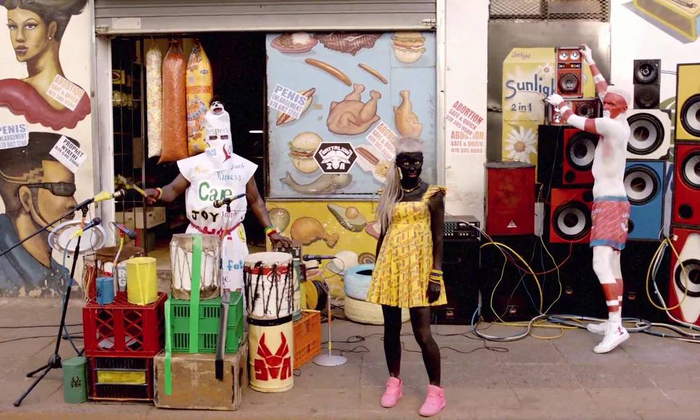 The main part includes several settings in which Die Antwoord are rapping and dancing. In the first setting we see the three members of Die Antwoord on the streets. Yo-Landi is painted dark brown with a bright yellow dress. She is covered in dollar signs and so are her eyes. Ninja is painted red and white, with the text Chosen 1 on his chest. A third character is wearing a hat that looks like one from the Ku Klux Klan, however his costume reads words like ‘love’, ‘create’, ‘hope’ and ‘respect’, which seems contradicting. In the background, there is a butcher, some colourful music speakers, musical instruments and advertisements for penis enlargements.