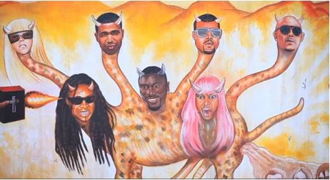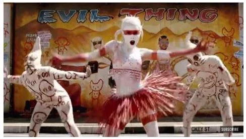 In the scenes that follow, the members of Die Antwoord and dancers are dressed in an unusual manner and their faces are painted with expressive colours. The dances that are performed look chaotic but also resemble traditional African dances. The combination of clothing, dancing, painted bodies and dark eyes give them a savage look. This savage look could be interpreted as an indication of how other people might be prejudiced about the South African culture. Furthermore, other musicians besides Lady Gaga are being made fun of in a sarcastic way, such as the images of Kanye West and Nicki Minaj with devil’s horns on their heads painted on the wall. This shows that the members of Die Antwoord see themselves as more ‘real’ compared to other musicians.