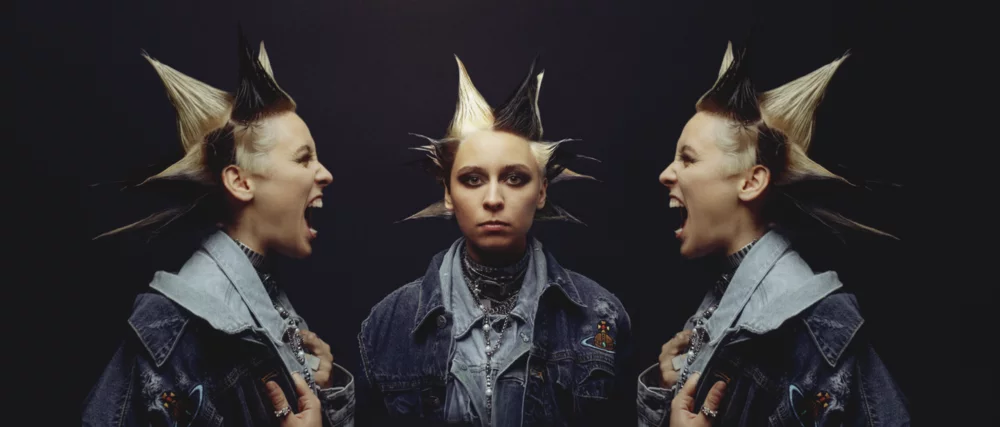 Carolina directly makes use of these iconic figures of the "Neue Deutsche Welle". Besides the eccentric, colourful yet grungy 80s punk inspired clothing, she styles her hair like Nina Hagen (as sung in "Heiß/Kalt" off of her 2023 EP), alternating between her mullet-like hair cut and half-bleached, gelled up spikes, completing her look with charcoal eyeliner.