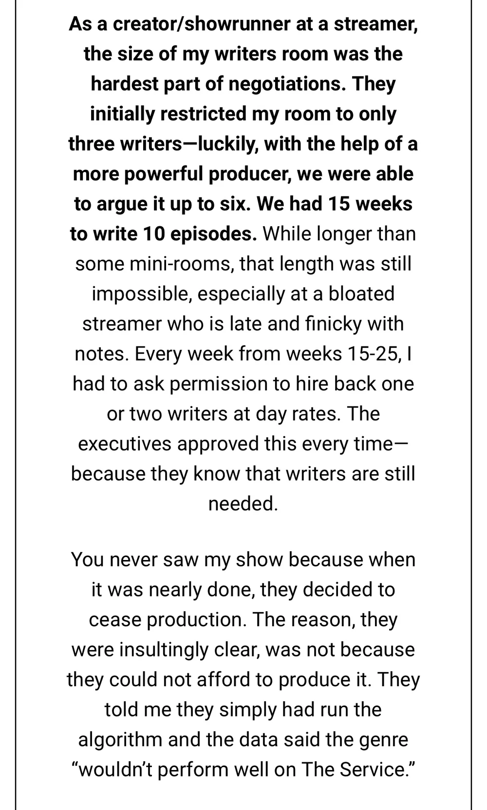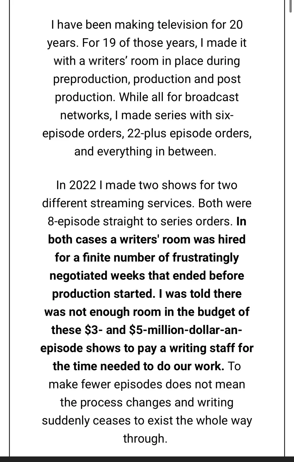 Additionally, by cutting short the number of writing staff on a production set, one of the main contributors to the entertainment industry receives less money and short working contracts, resulting in a “gig economy” - a labor market that relies heavily on temporary positions (Brock & Munichiello, 2022). This is heavily criticized as writers were typically involved in the entire creative journey, as expressed in the testimonial above.
