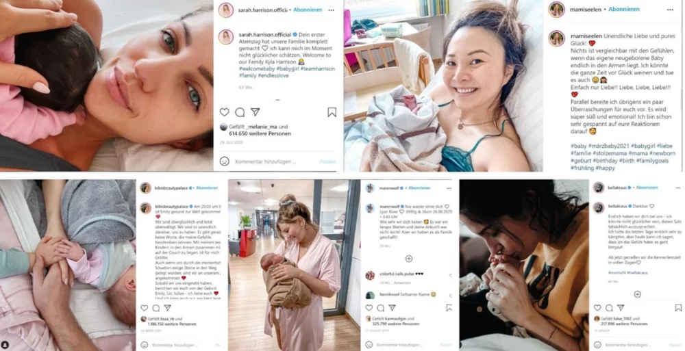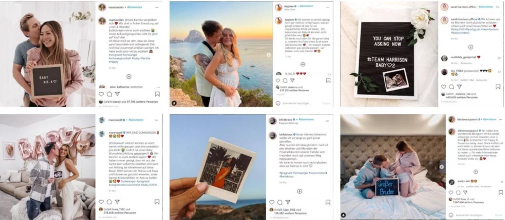 So for a long time, privacy was kept out of the public sphere. Through mass media and social networks, which thrive on private individuals sharing their lives with the public, this has long since ceased to be the case. In the following, the content shared by children, how it is staged, and how popular it is will be analyzed in relation to sharenting on the basis of German influencers. German laws are also taken into consideration. The topic of pregnancy is particularly popular with (family-) influencers. From the announcement to the gender reveal to the birth report, the same topics are usually found on Instagram among German influencers. The picture below shows pregnancy announcement posts from the six German influencers used as case studies in this article who all have between 500,000 and 8,000,000 followers (see Instagram pages of: mamiseelen, dagibee, sarah.harrison.official, marenwolf, bellakraus, bibisbeautypalace).