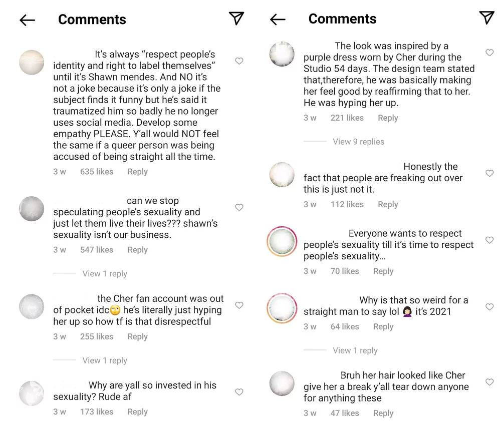 As seen in Figure 4 below, group 2 is firmly against the actions of group 1. As one user says, group 1 does not respect Mendes' identity and right to label himself. They say it is not a joke because the singer himself has stated before that people assuming his sexuality has traumatised him. They point out the irony of the fact that if the roles were reversed and a queer person was being accused of being straight all the time, we would collectively condemn this because it invalidated their sexuality. We would most likely go so far as to call that act homophobic. This particular comment has gotten 635 likes, which means many people agree with the message of this user. Other users agree with the fact that we should stop speculating about people's sexuality because it is not our business or simply because this type of language does not necessarily index a queer identity/sexuality. One user calls it "rude af" (read: rude as f*ck) to be so invested in Mendes' sexuality and another points out the fact that Camila was inspired by Cher, so it is not weird at all for Mendes to reaffirm she indeed looks like Cher.