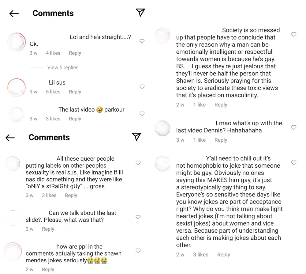 @Defnoodles' post shows that several people think Mendes saying "It’s giving Cher" indicates the singer is queer, as they find it strange for a straight man to say such a phrase. Though some of the comments on the Instagram post seem to agree with the statements in the post (namely that Mendes could not possibly be straight), most are completely opposed to making assumptions about the singer’s sexuality. As seen in Figure 3 below, one user posted a sarcastic comment questioning Mendes' presentation as straight, which got four likes. Another user went so far as to say that Mendes' remark is 'sus,' i.e. suspicious, which indicates they too distrust Mendes' identification as being straight. This comment garnered five likes or 'endorsements.' Lastly, one user tells everyone to 'chill out' because it is not homophobic to make jokes about stereotypically gay language, everyone is just too sensitive these days.