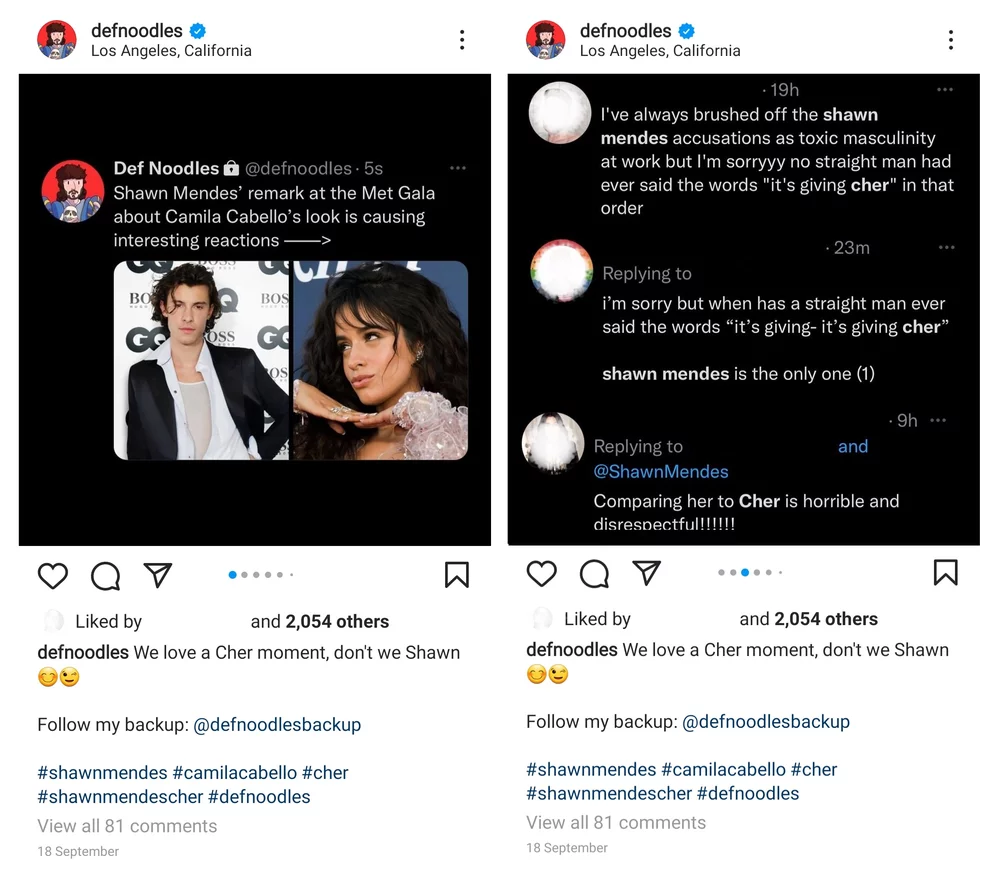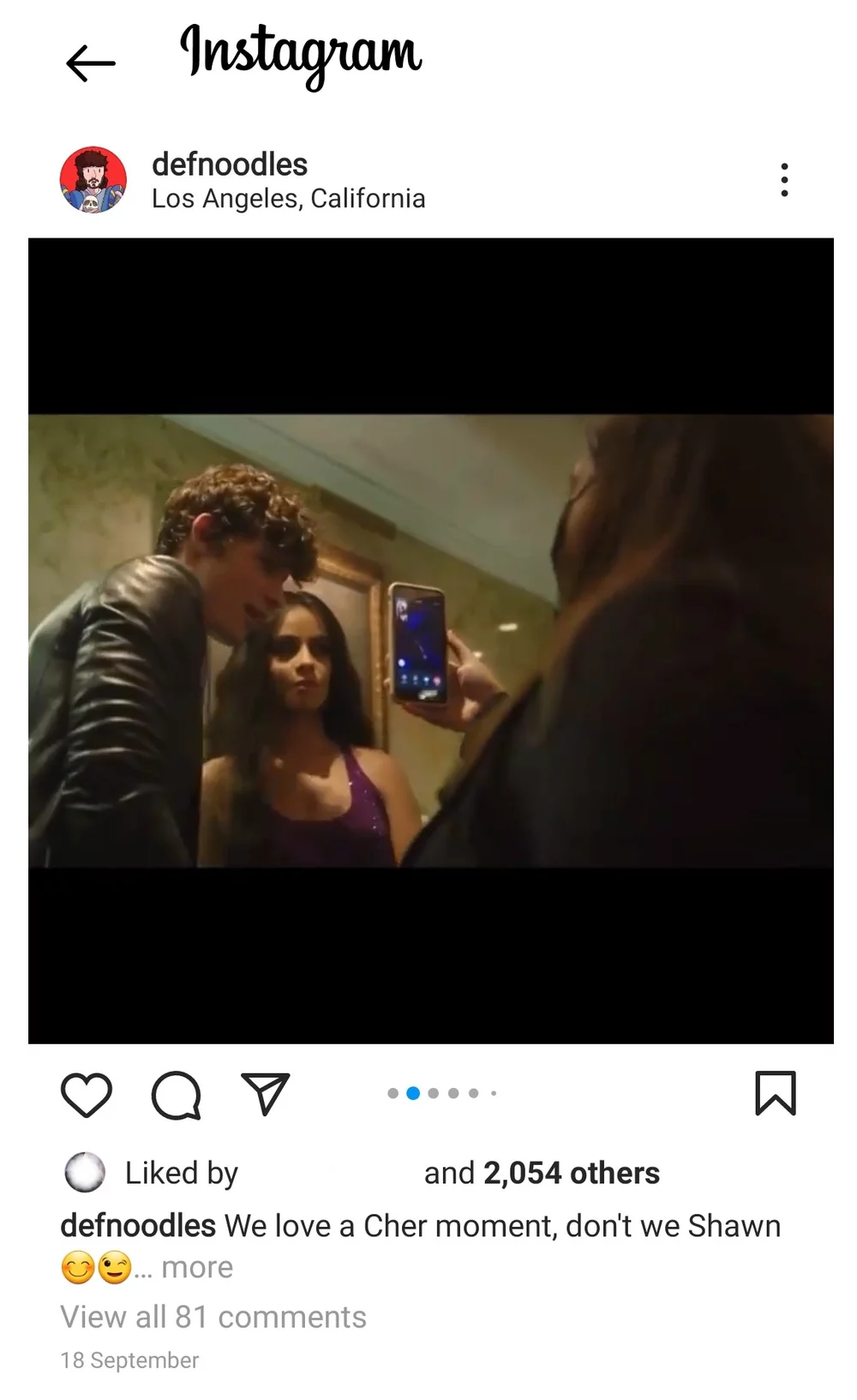 On the 18th of September 2021, Instagram account @defnoodles (a commentary account that reports on celebrity/influencer gossip, news, drama, etc.) made a post about the discourse that had recently been emerging about the remark Mendes made in the Vogue video. The post (see Figure 1 below) consists of a couple of different slides of which the first three are the most important. The first one serves as a sort of thumbnail, indicating the subject of the post and the third one is an example of some of the statements people have been making about the video on Twitter.