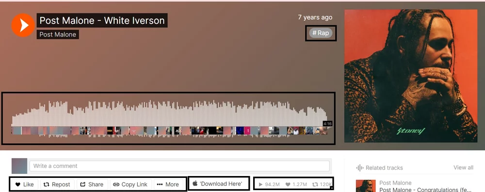 “SoundCloud social interactive features” (Hubbles et al, 2017). As can be seen in the highlighted areas in figure 1, the streaming service invites users to listen, comment, like, repost and share tracks, "fostering an online community through its inclusion of features (…) more commonly seen on social media” (Verespy, 2022). “Users have the ability to comment on them <tracks> and easily share them to their own feeds" (Rindner 2021). These features allow users to actively participate in the circulation of music audio as users can actively share, repost, like and comment on the tracks. White Iverson entrenched what distinguishes SoundCloud from other streaming platforms: its accessibility and social interactive features.