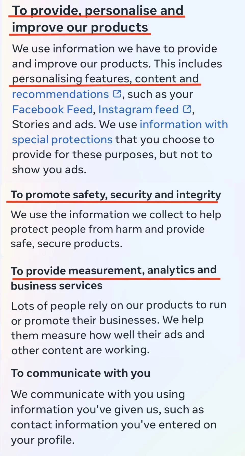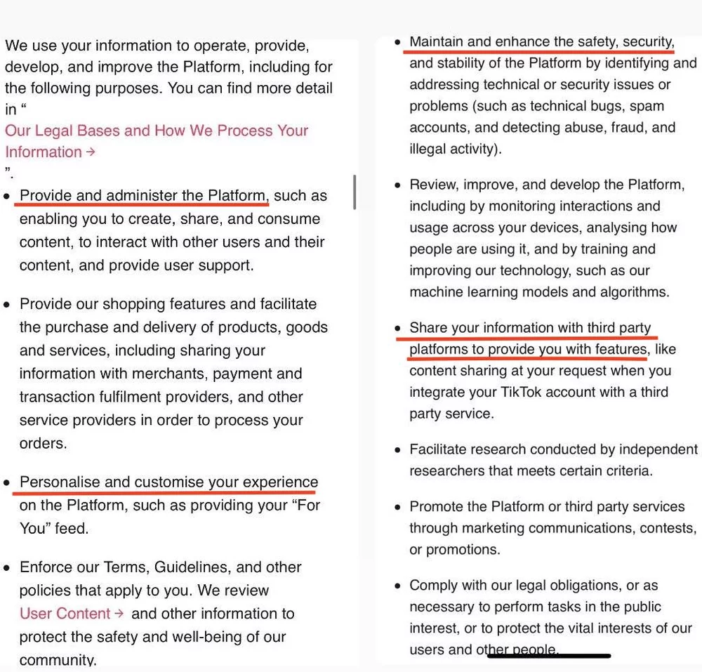 As identified in Figures 5 & 6, both privacy policies’ main reason for needing such data is to provide, personalize and improve your experience, focusing on the narrative that processing data is for the greater benefit of the user. Additionally, both TikTok and Meta justify data collection through assurance of safety and security. Other reasons include customization of advertisements and providing analytics, especially in the privacy policy of Meta, whose products are used as business tools. From the review of this section, it is apparent that the policies are very similar.