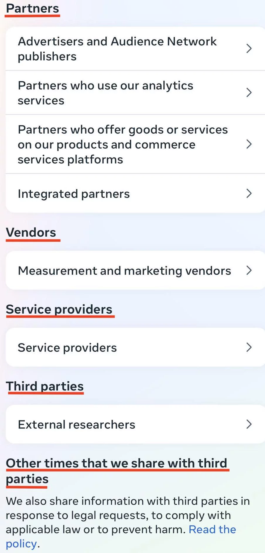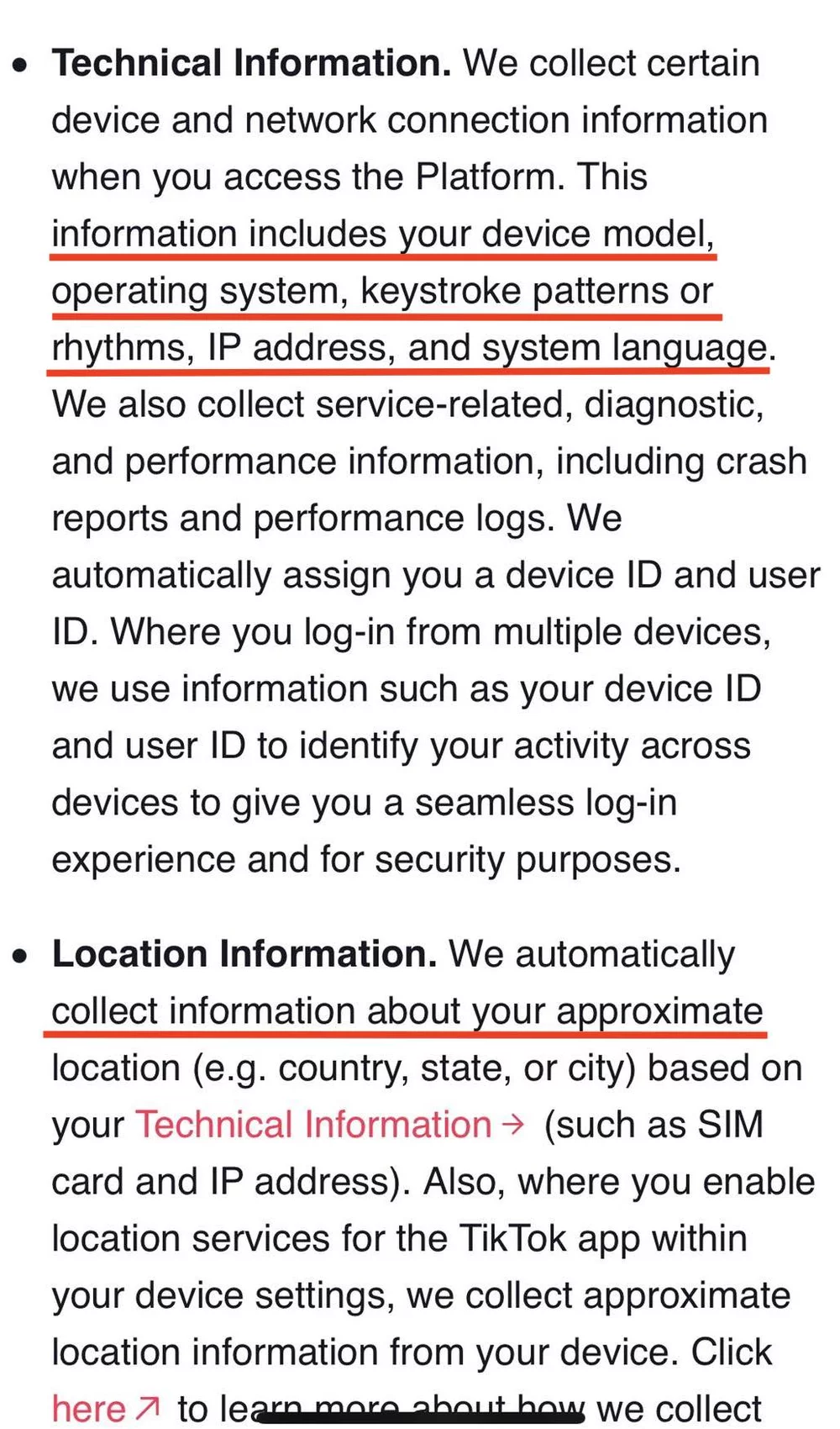 Moving forward, the second type of information provided by the user accessing these platforms is regarded as technical. As seen in Figures 3 & 4, both platforms collect data on approximate location (exact location if the user allows it), IP address, device model, operating system, and activity on the device (keystrokes, performance, preferences).  Mentioned further in the list, and not included in Figure 3, Tik Tok also collects metadata from your photos and videos which have been used to create content, or to which they have access, similar to the fifth point in Figure 4 of Meta’s policy.  Additionally, TikTok and Meta make use of information from other sources about their users mentioning advertising websites, payment providers, and other partners. From this we can see that both companies gain knowledge of our online and offline practices through other sources, being able to build on our technological identity. Therefore, the types of technical data collected from each platform are identical.