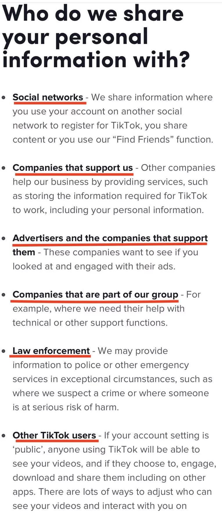 In the final section of this analysis, both privacy policies insist that they do not sell the personal information of their users to other organizations but share it based on different reasons. In each privacy policy, all of the receivers of information are highlighted in Figures 7 & 8, including other social networks through which you can share the content of the platform, companies that deal with the storing of general data, and advertisers/creators who can asses their commercial development on the platform. After focusing on this section, it is clear that information is shared with identical types of organizations/groups, thus underlining the similarities between the two privacy policies.