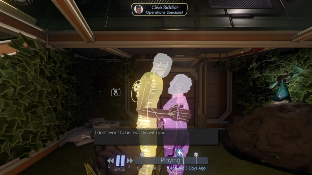 From a procedural Rhetoric perspective, the developers of Tacoma have created a world where the player must interact with their surrounding via the use of the space stations augmented reality to experience the game at all. This alters the players vision to watch past scenarios that occurred in a room ranging from 3 days ago to a year. The augmented reality depicts individuals (the crew) as silhouettes and allows the player to fast forward and rewind past events to see and hear what the crew were doing.